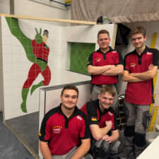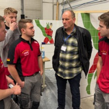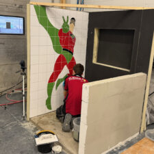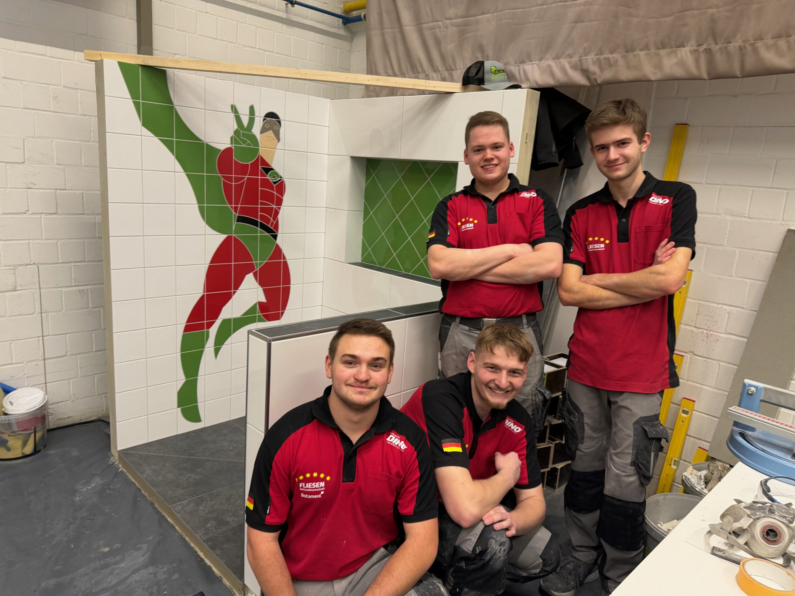 Ein Zeitkontingent von insgesamt 22 Stunden bekam das Team, um eine komplette Duschecke anzufertigen. Die erste Teilaufgabe bestand in der Gestaltung der linken Wand, auf der eine Botament-Werbefigur gefliest werden sollte: der Green Hero. In der rechten Wandfläche erstellten die Teammitglieder eine Nische, deren Rückwand sie mit diagonal verlegten Fliesen gestalteten. Innerhalb der vorgegebenen Zeit bauten sie zudem eine Schamwand, an deren Kanten Schutzschienen angebracht werden mussten. „Eine weitere Herausforderung stellte der Fußboden dar, auf den Gefälleestrich aufgebracht und ein Punktablauf installiert werden sollte.“ Daher mussten die Bodenfliesen komplett aufgeschnitten und abschließend in Trapezform verlegt werden. „Wir haben Qualitätsunterschiede festgestellt, das war jedoch zu erwarten“, erklärt Bundestrainer Marcel Beyer. „Niko Schleicher und Luis Brauner sind in ihrer dritten Wettkampfsaison – sie haben in den vielen absolvierten Trainingseinheiten umfangreiche Erfahrungen sammeln können, von denen die Beiden jetzt profitieren.“